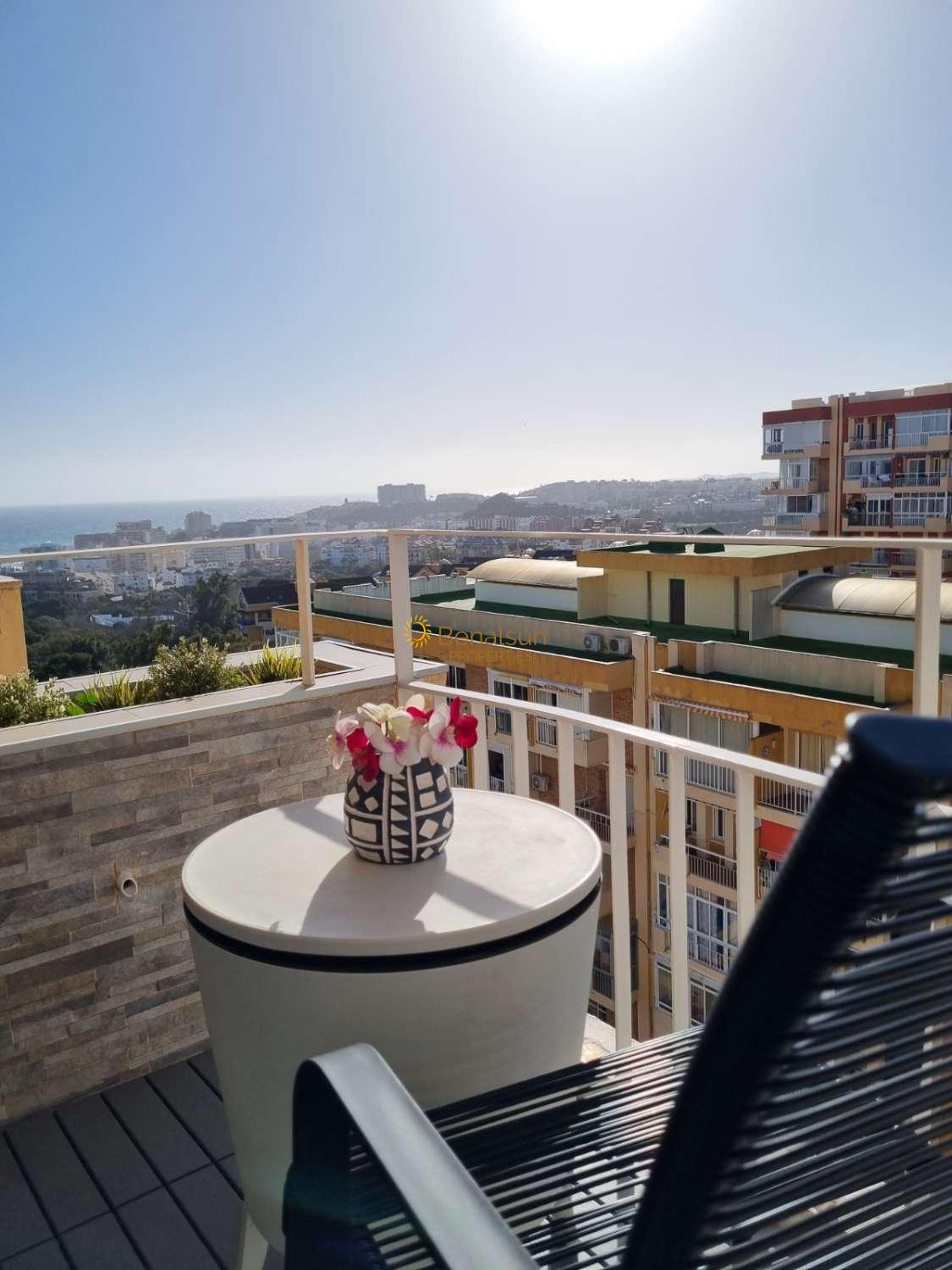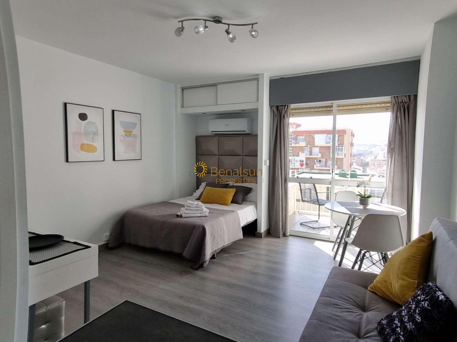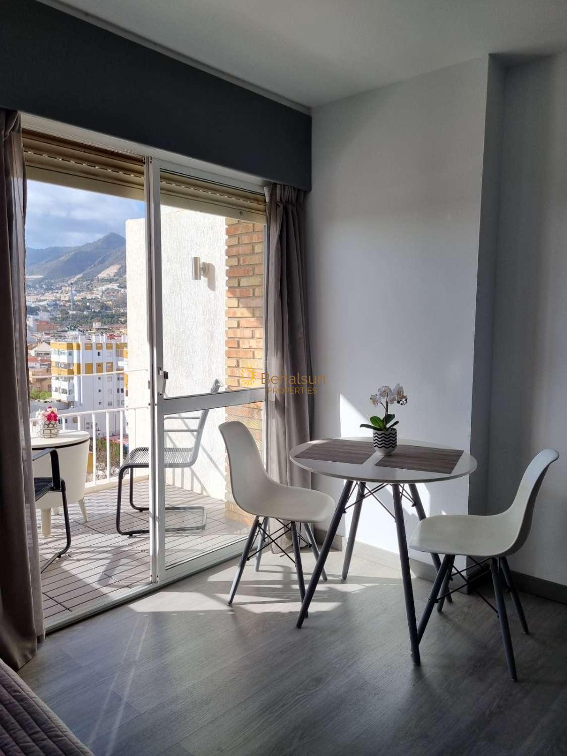 Flot studie med havudsigt til leje fra 01.02.26 - 31.5.26 og fra 01/09/2026 til 30/06/2027 i Arroyo de la Miel (Benalmadena). Den har 35 m2 bygget, 30 m2 brugbar, vestorienteret, 9. sal, varm og kold aircondition, 24-timers reception, ubestemt parkering.