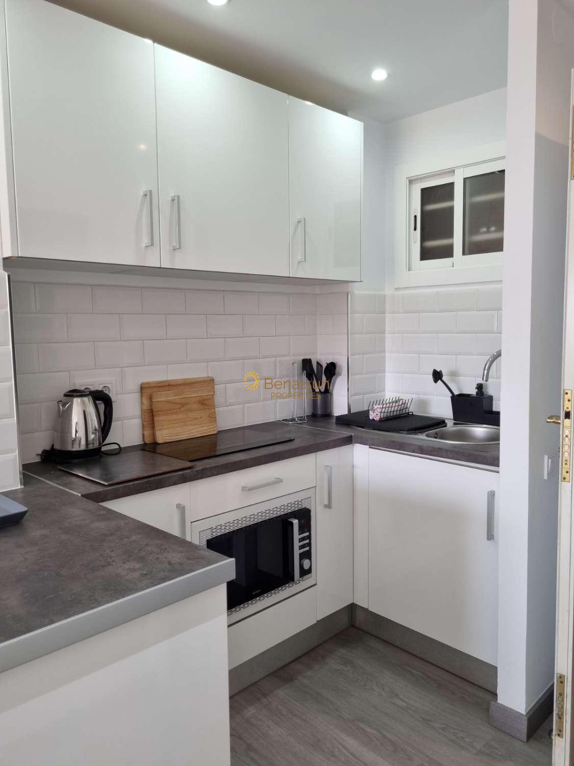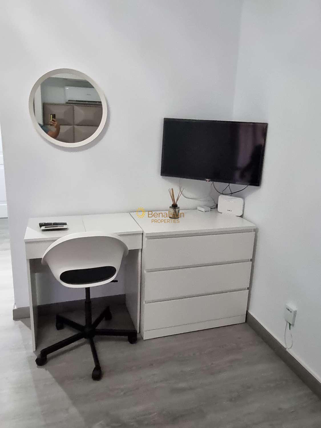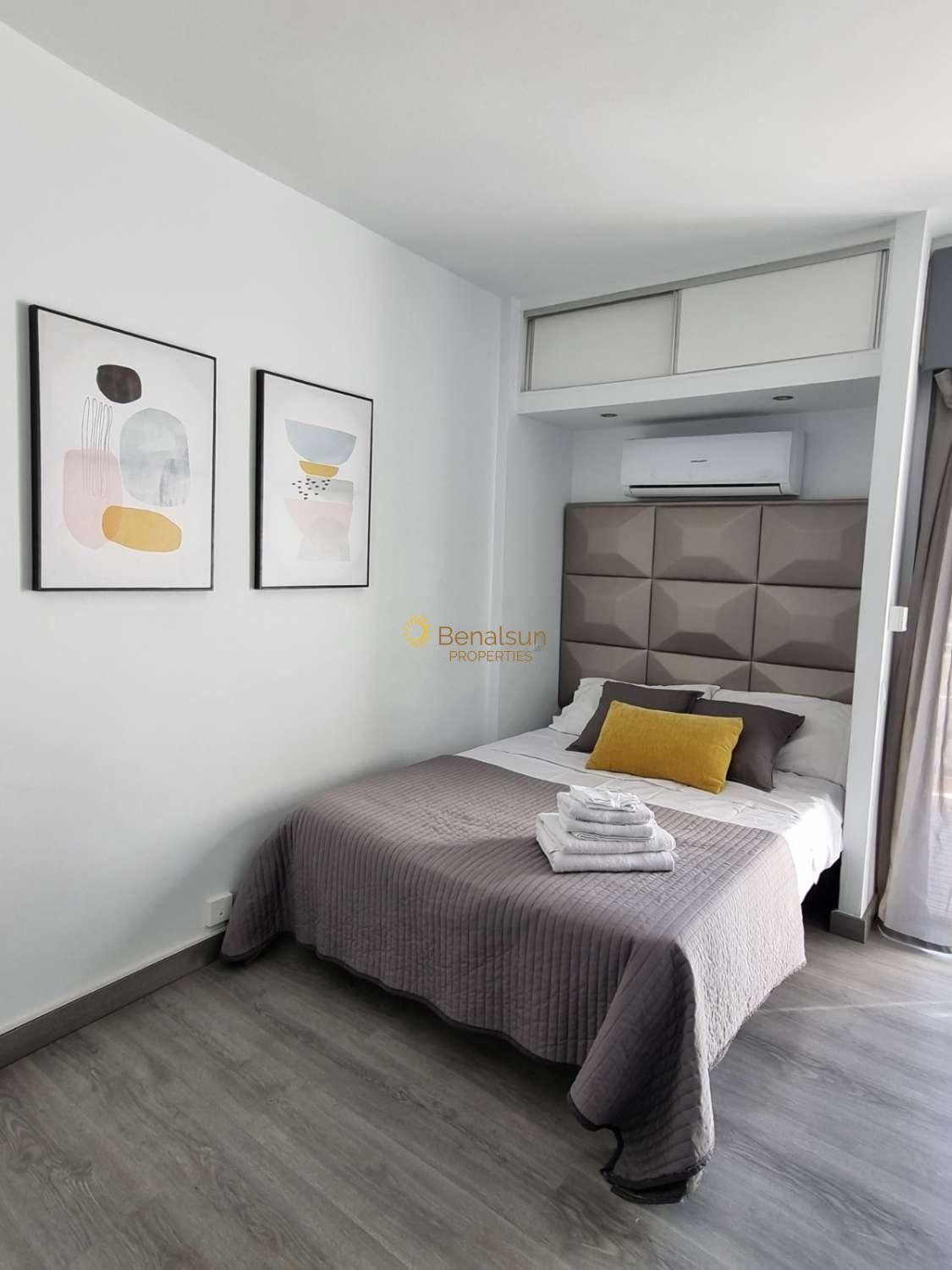 Flot studie med havudsigt til leje fra 01.02.26 - 31.5.26 og fra 01/09/2026 til 30/06/2027 i Arroyo de la Miel (Benalmadena). Den har 35 m2 bygget, 30 m2 brugbar, vestorienteret, 9. sal, varm og kold aircondition, 24-timers reception, ubestemt parkering.