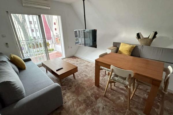 Salón luminoso con acceso a balcón y vistas al mar: Mesa con sillas para comer y trabajar, con TV con canales internacionales.