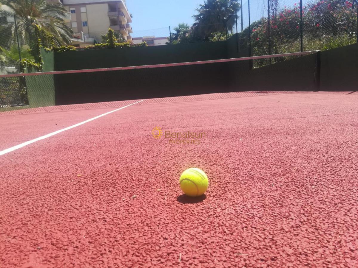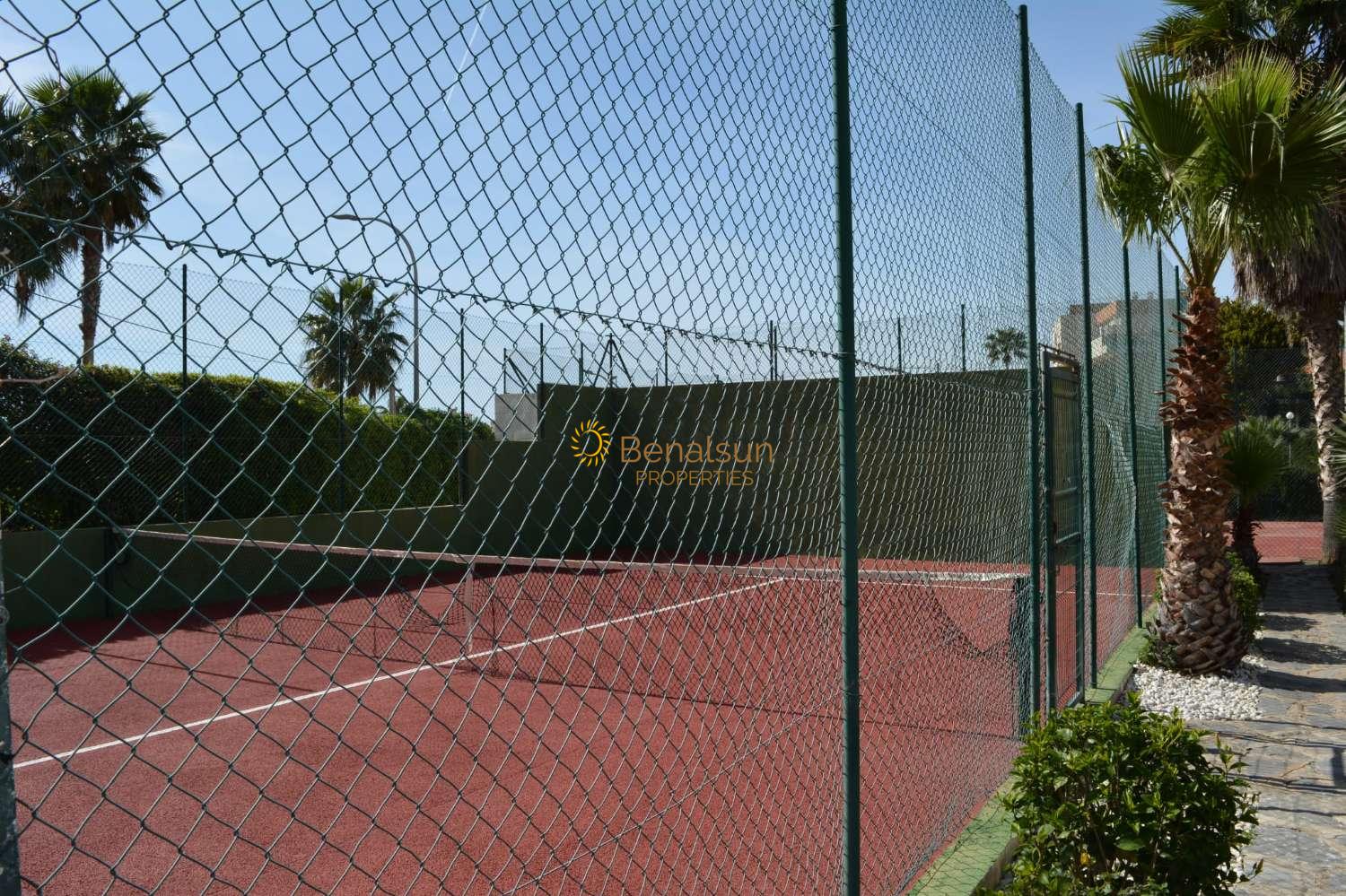 Urbanización con gran jardín y 3 piscinas , 1 de adultos , otra de niños y una interior con agua caliente abierta todo el año , pista de tenis . Cruzas y tienes la playa . Tiene todas las facilidades cerca : parada de bus , Mercadona , farmacia , restaurantes .