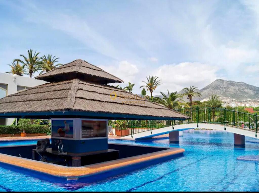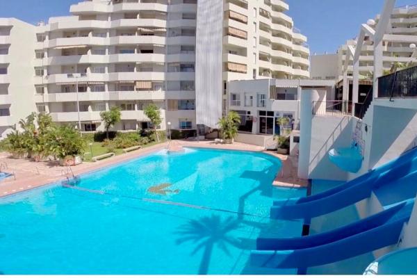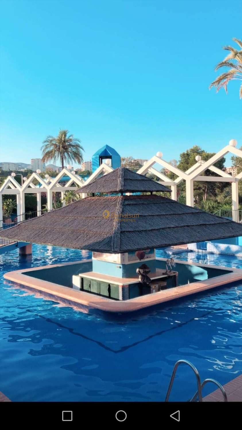 La vivienda consta de 1 dormitorio , 1 baño , salon con cocina americana equipada y terraza . Situado en una de los complejos mas demandados de Benalmádena Costa cuenta con 6 piscinas con toboganes , grandes jardines , spa , gimnasio , supermercado , restaurante .Servicio de Recepción 24 horas . Tiene parking comunitario no asignado . Al lado del parque de la paloma , de farmacia , de restaurants , supermercados . A 50 metros de la playa y paseo marítimo .