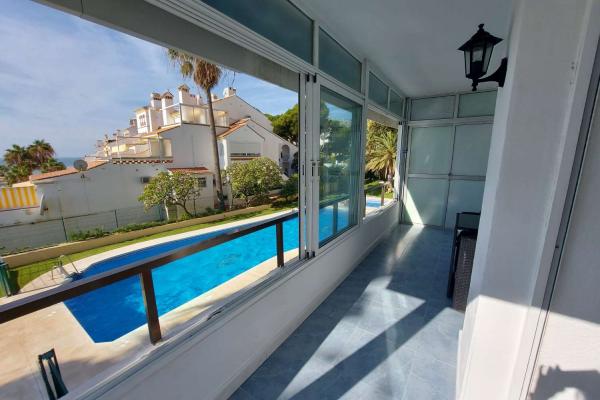 Situado en una urbanización con piscina y jardines con acceso directo al paseo marítimo . Cerca de todas las facilidades : a 10 min. andando de Puerto Marina , parada de bus a 50 metros , bancos , supermercados , comercios , restaurantes , gimnasio