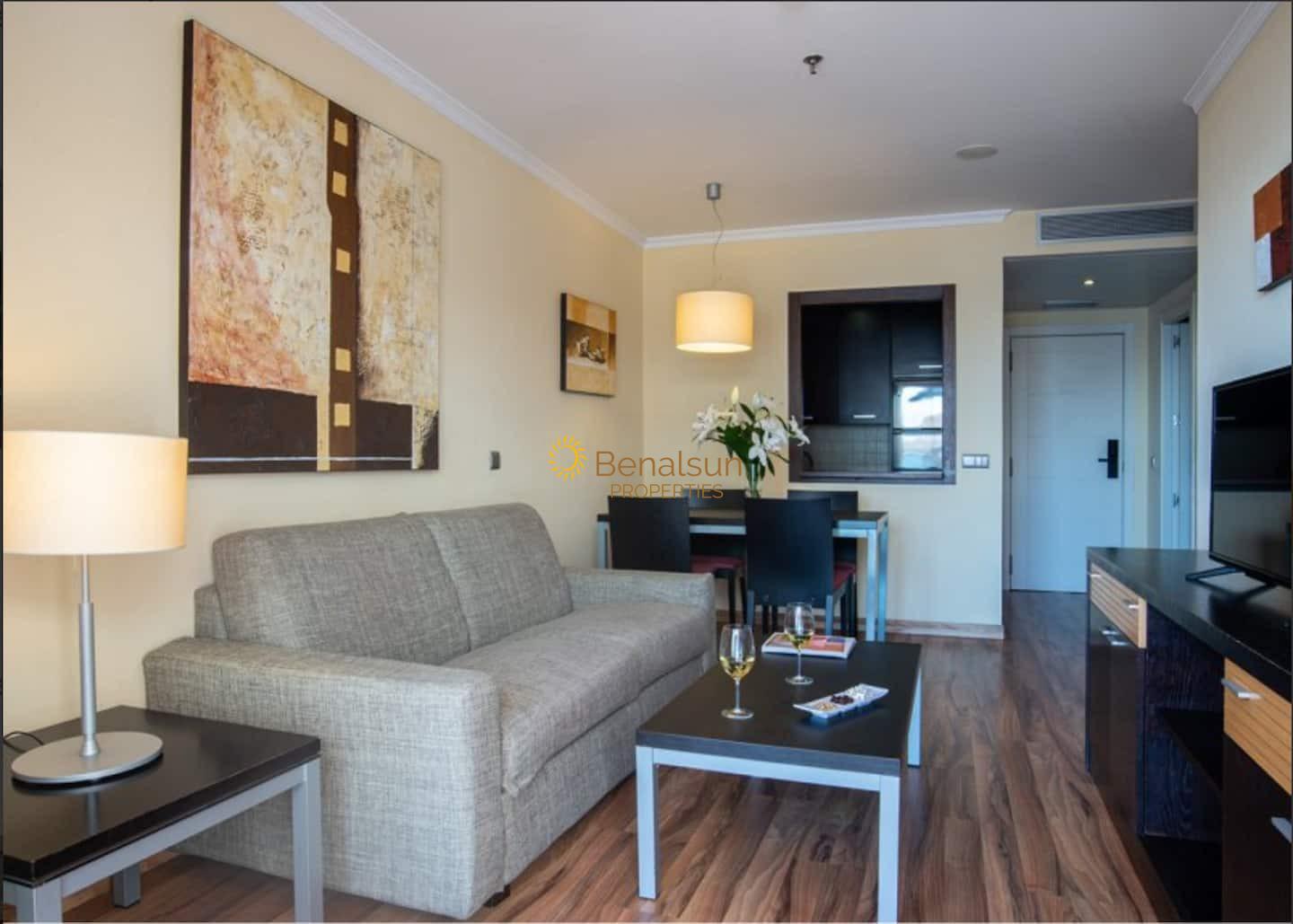 LA VIVIENDA CONSTA DE SALON COMEDOR , 1 DORMITORIO , 1 BAÑO , COCINA AMERICANA EQUIPADA , AMPLIA TERRAZA , SITUADO EN UNA 5a PLANTA , ORIENTACION OESTE , MUY LUMINOSO INCLUYE WIFI , PLAZA DE GARAJE Y TRASTERO EN EL PRECIO . RECEPCION , PISCINA , RESTAURANTE , SUPERMECADO JUSTO ABAJO Y SPA . A 90 METROS DE LA PLAYA Y CERCA DE AVENIDA DE LAS PALMERAS A POCOS METROS ANDANDO ENCONTRARÁS SUPERMERCADOS , FARMACIA , CLUB DE LAS RAQUETAS , RESTAURANTES Y COMERCIOS VARIOS .