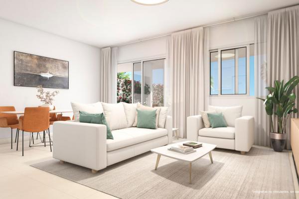 Apartamentos de 2 dormitorios, 2 baños, vivienda superficie construida desde 86,4 m2., superficie total 129,07m2 , 22,3m2 de terraza cubierta y 48,36 m2 descubierta.