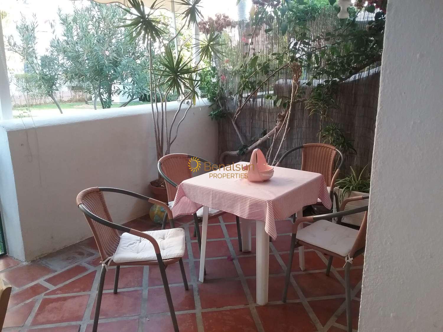 EN PLANTA BAJA: cocina con lavadero, totalmente equipada y baño con ducha, salon comedor espacioso con ventilador, amplio porche-terraza que da a su vez a un gran jardín con césped.