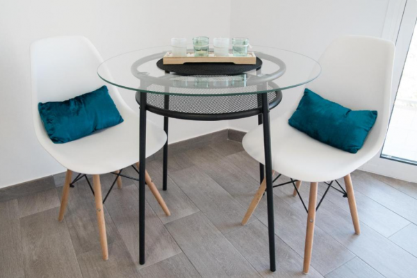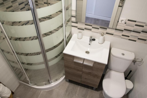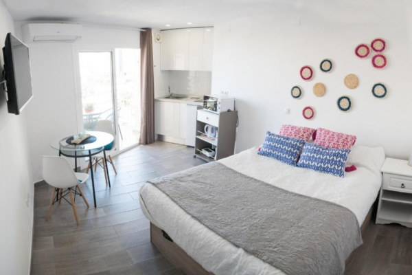 Estudio amplio con cama de matrimonio, cocina abierta, 1 cuarto de baño con plato ducha. Dispone de todo el menaje (toallas, cubertería, y utensilios).