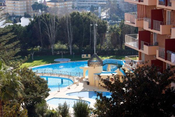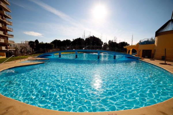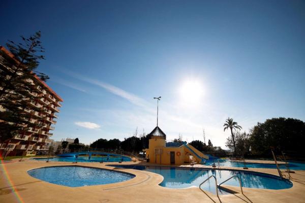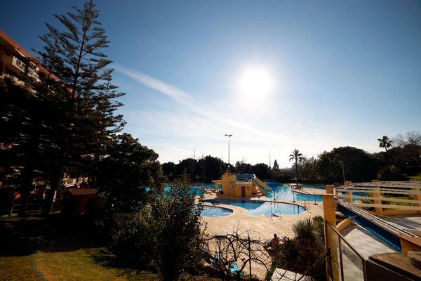 Complejo con grandes zonas verdes y piscinas.