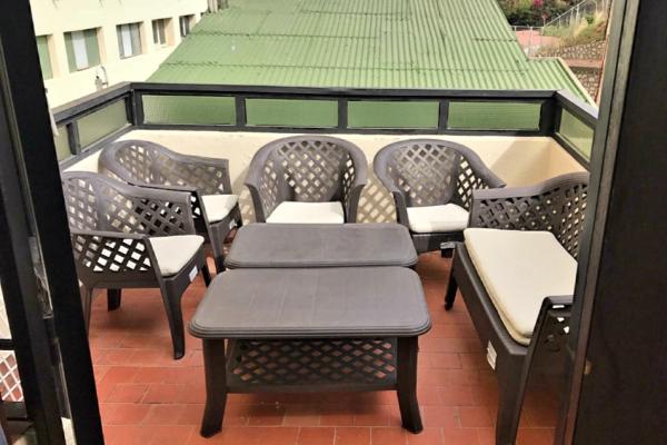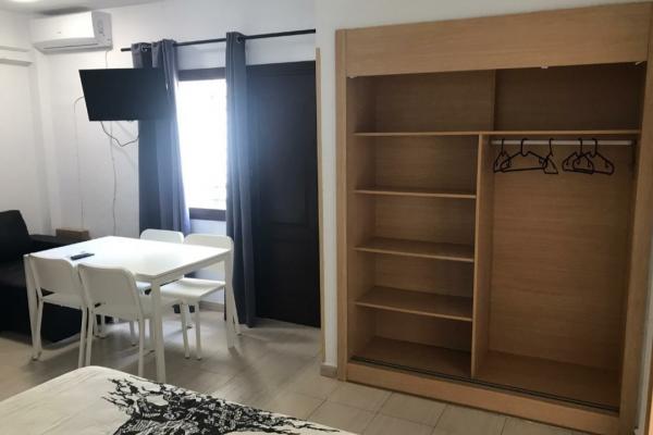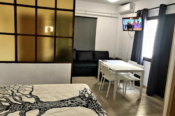 Cuenta con terraza independiente y privada orientada hacia el mar. La sala de estar/dormitorio tiene sofá, TV, cama de matrimonio (con canapé abatible) que se encuentra semi-independiente por mampara de separación), Armario, mesa y sillas, etc. La cocina es independiente y está amueblada y equipada (horno también) . El cuarto de baño es espacioso, con luz natural y cuenta con bañera y lavadora.