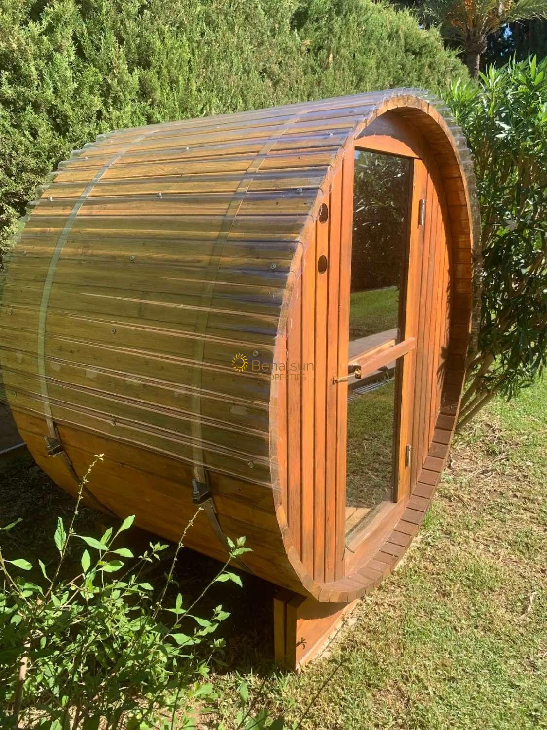 Esta fabulosa villa con capacidad para 6 personas consta de 3 dormitorios, 2 baños, amplio salón/sala familiar con chimenea, tv de 55 pulgadas, gran área de cocina, sauna al aire libre, piscina privada no climatizada y área de barbacoa, jardín con sistema de riego, estacionamiento para aparcar coches.