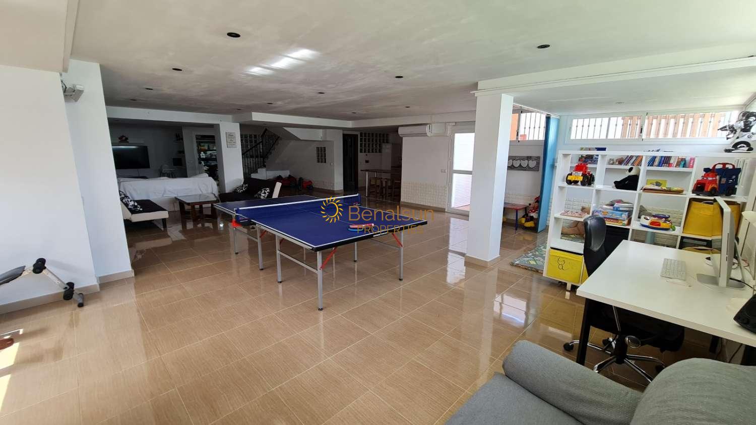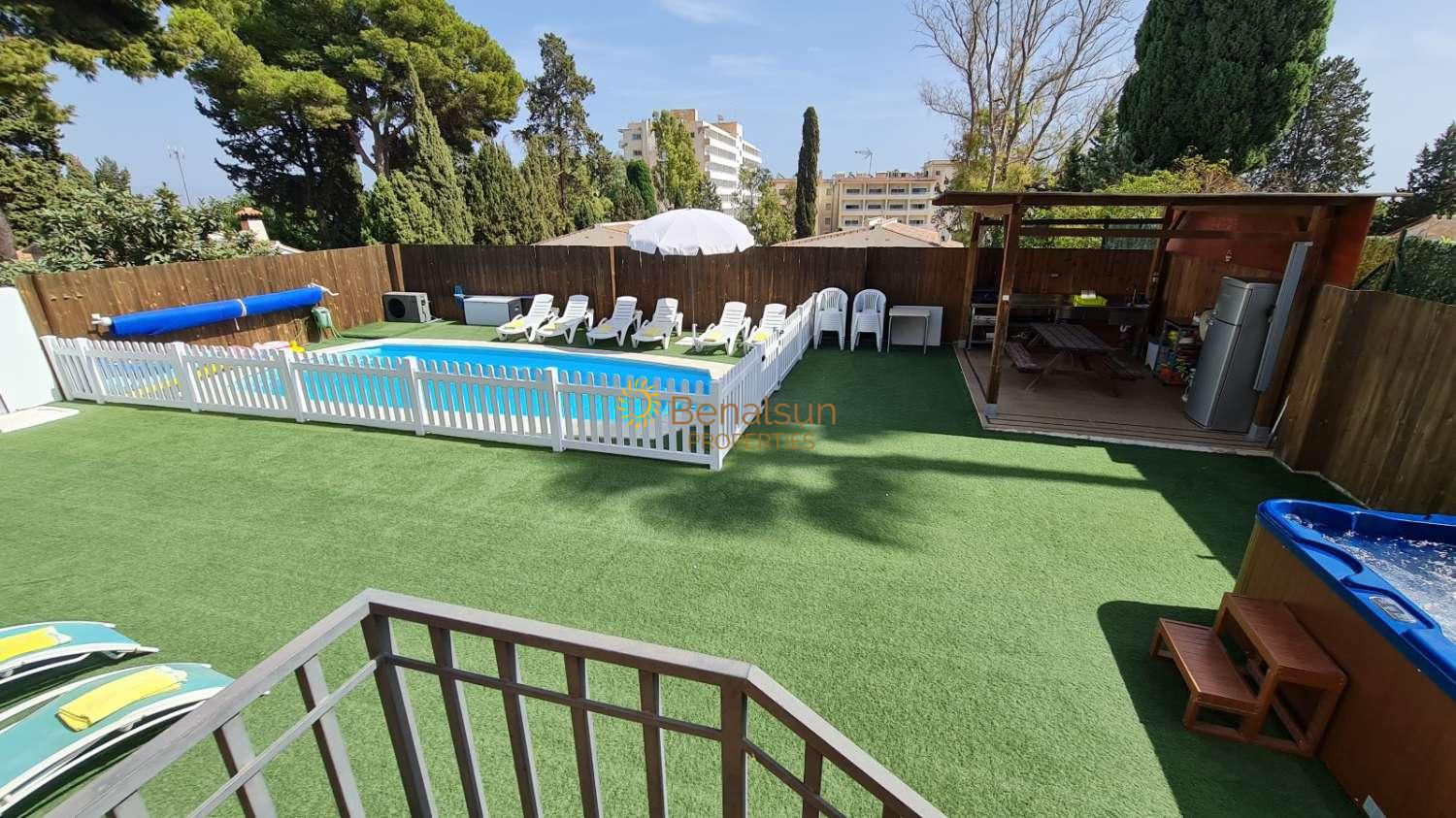 La vivienda consta de 5 dormitorios 4 baños , 1 aseo , 2 cocinas equipadas cafetera automatica profesional , salon comedor , terraza ,gran jardín con piscina salada y climatizada , jacuzzi barbacoa de gas completísima , seguridad infantil , bar exterior , mesa de pin pong , baño de vapor , futbolín , 3 tv inteligentes grandes con Netflix , Prime y hbo conexión a internet fibra óptica , un apple IMac de 27" con un sonido increible, aparatos deportivos , sauna y sistema de agua potable ilimitado. El jardín y el área de piscina tienen 6 tumbonas , zona blanda para niños con juguetes . Hay una furgoneta de 9 plazas gratuita y un scooter de 125cc. Está a 1,2 km de la playa , a 1 km del centro de Torremolinos , restaurantes cerca.