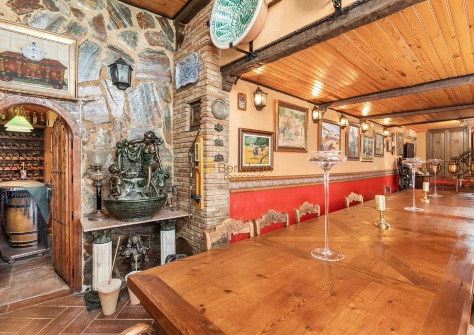 - 1 : 3 dormitorios + 2 baños uno de ellos en suite ( ambos con plato de ducha ) todos equipados con armarios grandes , dormitorio principal y vestidor , en esta misma planta nos encontramos con otro gran salón con biblioteca y comedor con capacidad para 24 personas y bodega , unos escalones más abajo un bar con gran sala de ocio con piano zona ideal para hacer fiestas privadas con familia y amigos , baño con jacuzzi , desde aquí se accede a la piscina , jacuzzi y terraza con barbacoa , horno , y gran mesa para comidas o fiestas al aire libre . Sauna finlandesa. En el gran jardín encontrarás arboles frutales , invernadero , todo ello rodeado con pilares de piedra .